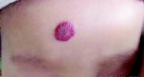 这样的红色胎记医学上称之为血管瘤。血管瘤是小儿最常见先天性血管畸形,发病率约为3—8%,它可以出现在身体每个部位,以皮肤及皮下组织最为多见,其次可见于口腔黏膜、肌肉,也可发生在骨骼、内脏、大脑等器官,小的血管瘤只有针头大小,如毛细血管瘤,大的几乎侵犯整个面部或手部。