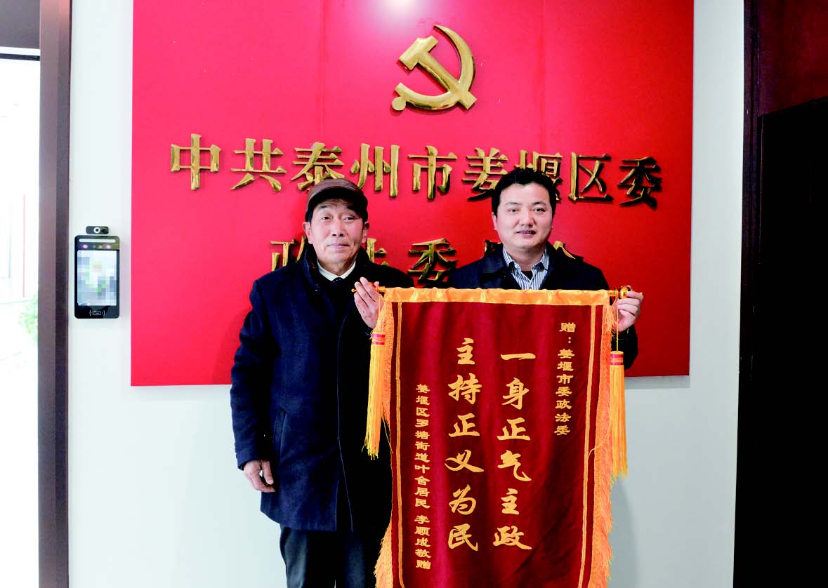 2月23日,市民老李专程到区委政法委,感谢区委政法委牵头协调区信访局、农业农村局、罗塘街道等部门单位,为他解决了一桩长达7年的“历史遗留”问题。图为老李向区委政法委副书记郭晓彬(右)赠送锦旗。