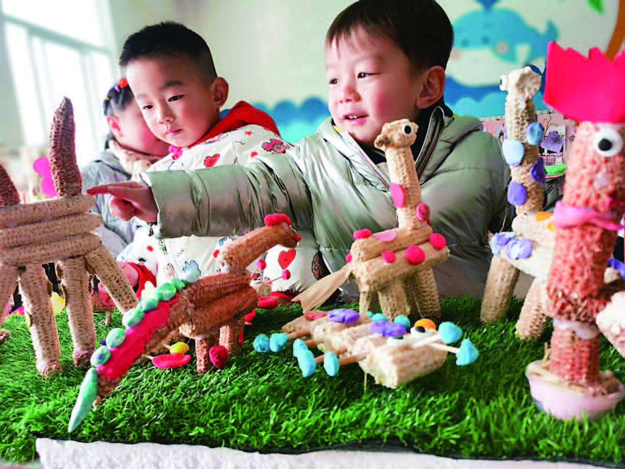 叶甸幼儿园充分挖掘乡土资源,开展“百变玉米,‘芯’花样”创意手工活动,培养幼儿的想象力和动手能力,让他们在活动中体验成功的快乐。图为孩子们在欣赏自己的手工作品。
