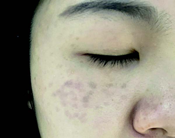 褐青色痣主要表现为颧部对称分布的灰褐色、黑灰色斑点。分为轻、中、重型,轻型局限于颧部,呈浅褐色颗粒状。中型颗粒稍大,呈黑褐色,严重者呈片状。重型皮损面积大,呈斑块状,累及双侧额颞部、眼睑、鼻部。