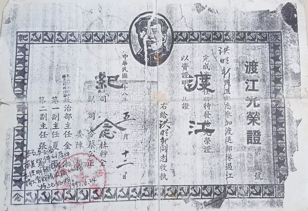 鉴于洪明新的积极表现,上级决定为他记二等功一次,并给他颁发了《渡江光荣证书》。